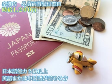 中部国際空港「セントレア」内の外貨両替受付窓口にて 外貨両替業務を行って頂きます。 日本人はもちろん、海外のお客様も日本円に両替されるので、 日本語と英語、日本語と中国語のどちらか二ヶ国語を 話せる事が必須となります。 お金を扱うお仕事ですので、語学はもちろん、 計算や数字にも強い方に向いています。