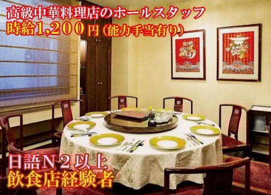 【高級中華料理店のホールスタッフ】 名古屋駅すぐの高級中華料理店でランチタイムのホールスタッフとして接客や配膳、片付けなどを行って頂きます。 中国語と日本語(N2以上)を話すことができれば、 家族滞在の方や留学生でも働けます! 高級な場所なので品位やマナーも自然と身につける事ができます。